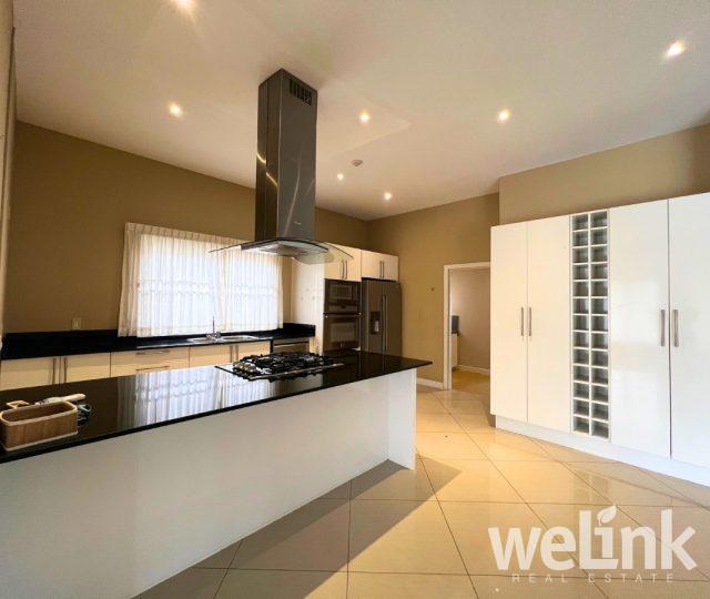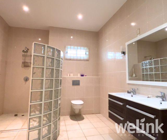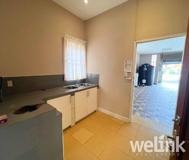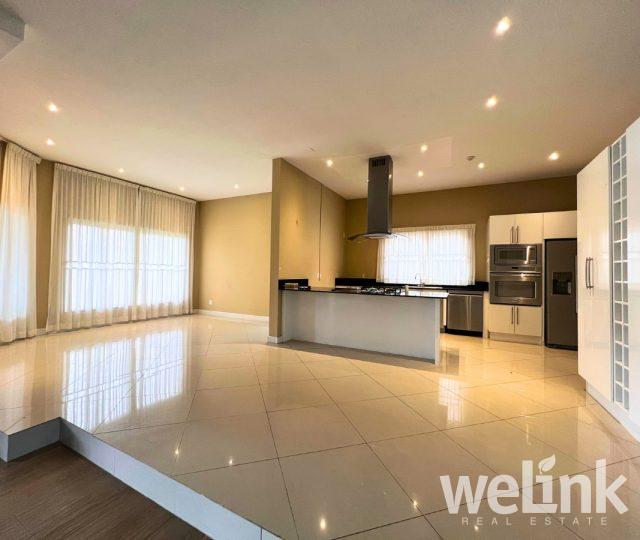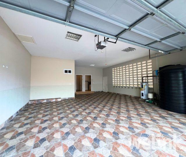 Bij binnenkomst in deze exclusieve woning leidt een imposante dubbele voordeur u naar een gastvrije, airconditioned woonkamer met een open keuken. De moderne keuken is volledig uitgerust met hoogwaardige apparatuur, waaronder een gasfornuis met oven, een dubbeldeurs koelkast, een vaatwasser en een magnetron. De aangrenzende eethoek is toegankelijk vanuit zowel de keuken als de woonkamer, waardoor deze ruimte perfect is voor gezellige diners en familiebijeenkomsten. Vanuit de woonkamer biedt een schuifdeur directe toegang tot het ruime achterterras. Daarnaast is de keuken ook bereikbaar via de inpandige garage, die plaats biedt aan twee auto’s.