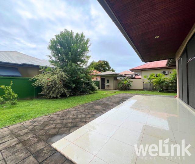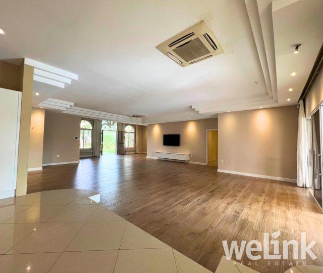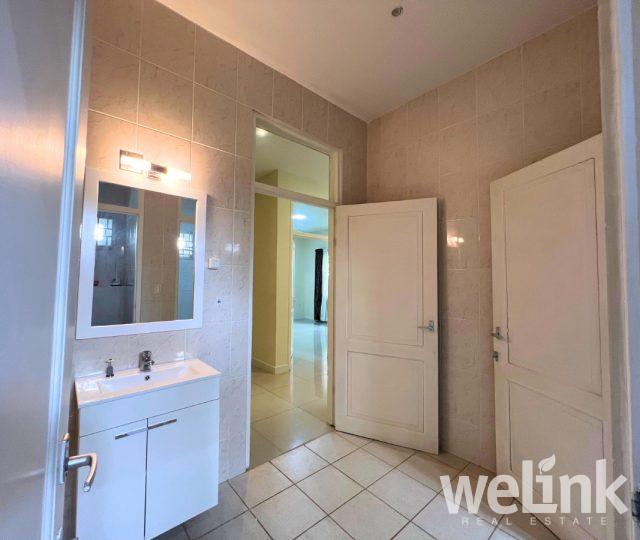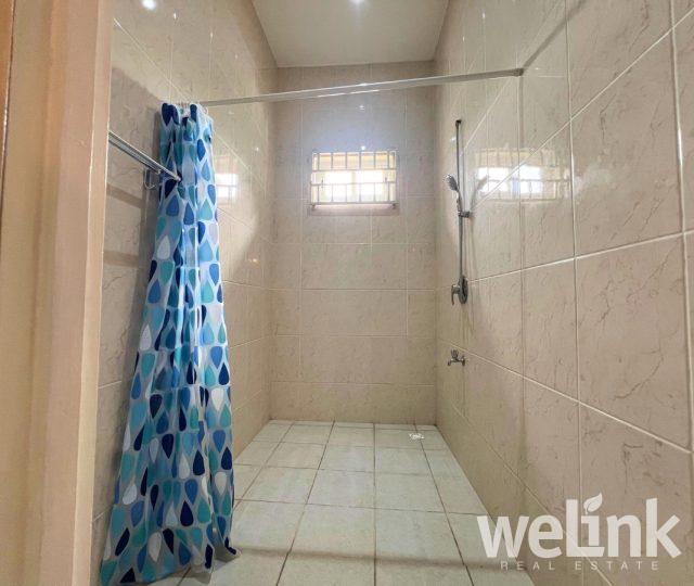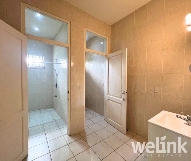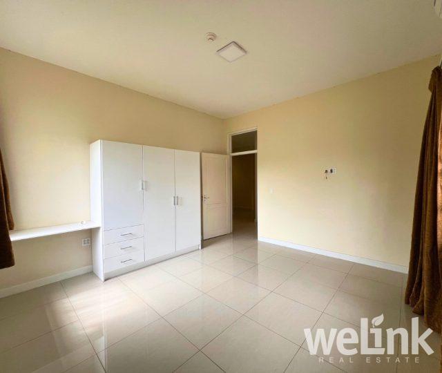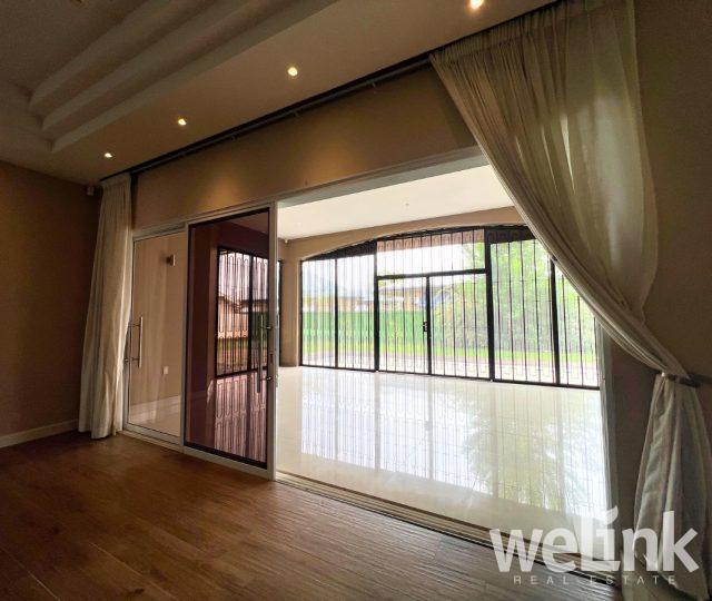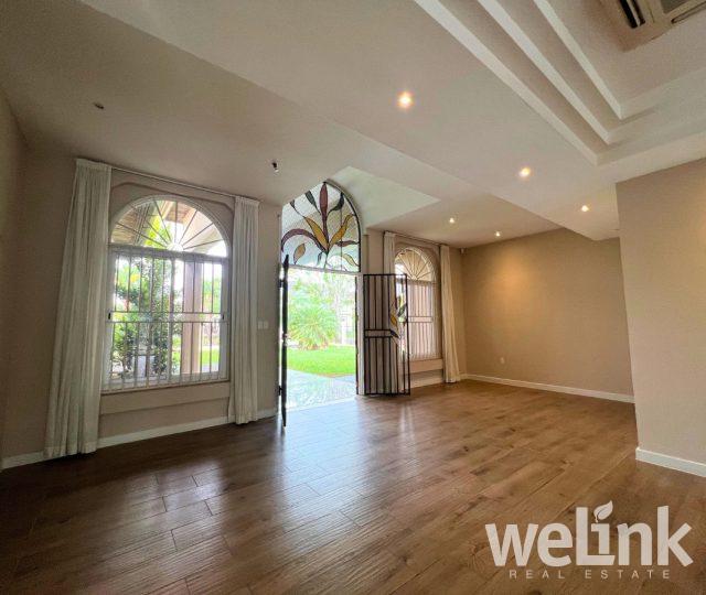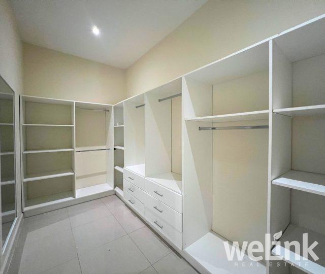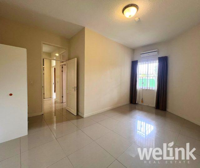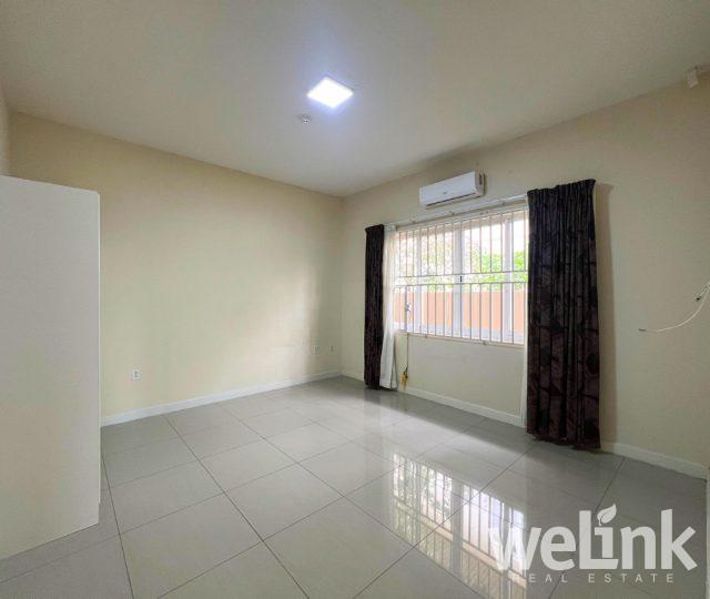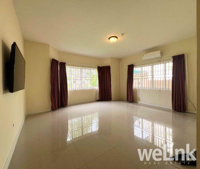 Een stevige deur scheidt de woonkamer van het slaapgedeelte, waar een T-vormige gang toegang biedt tot de master bedroom, drie ruime slaapkamers en een gemeenschappelijke badkamer met toilet. De master bedroom beschikt over een royale walk-in closet en een luxe privébadkamer. De overige slaapkamers zijn voorzien van ingebouwde kasten, en alle kamers zijn uitgerust met airconditioning voor optimaal comfort.