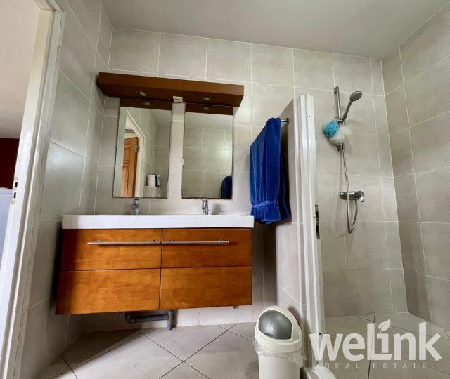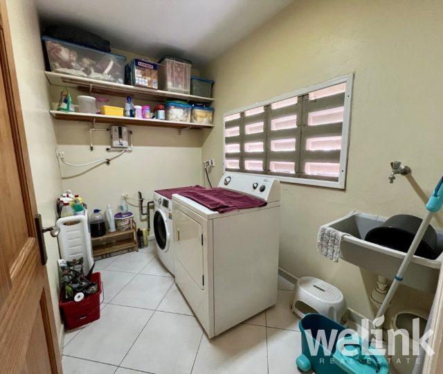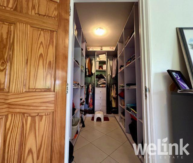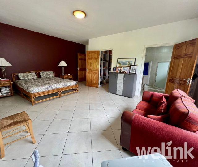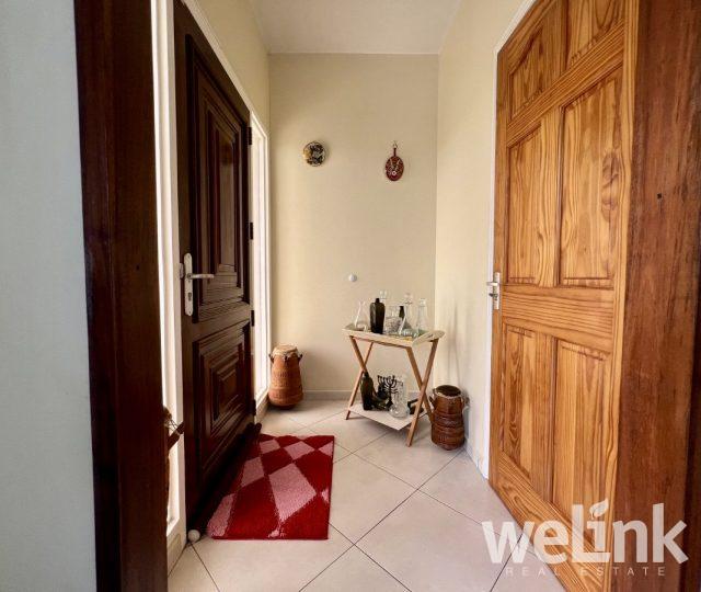 Deze moderne woning straalt luxe uit door zijn indrukwekkende verhoogde constructie en elegante toegangstrap. Bij binnenkomst door de voordeur komt u in een ruime woon- en eetkamer met een gastentoilet en een open keuken. De keuken is ruim en volledig uitgerust, inclusief twee grote koelkasten. Aangrenzend aan de keuken bevindt zich een multifunctionele ruimte die als pantry of opslag kan dienen. Vanuit de woonkamer leidt een gang naar twee slaapkamers, die beide beschikken over een eigen badkamer en toilet. De master bedroom is iets groter dan de andere slaapkamer en heeft een eigen walk-in closet. Alle badkamers zijn voorzien van hoogwaardig sanitair. Het hele huis is uitgerust met airconditioning voor extra comfort.