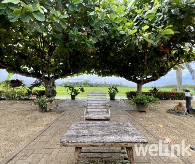 De woonkamer geeft toegang tot een groot achterterras, dat is voorzien van muskietengaas. Een trapje naar beneden leidt naar een gezellige tuin met hoge bomen en een prachtig uitzicht op een gracht/meer. Het betegelde terras direct aan het water is de perfecte plek om te ontspannen. De verkoelende bries, het stromende water en het uitzicht op het weelderige bos maken deze woning tot een unieke parel in het hart van Palm Village.