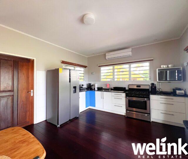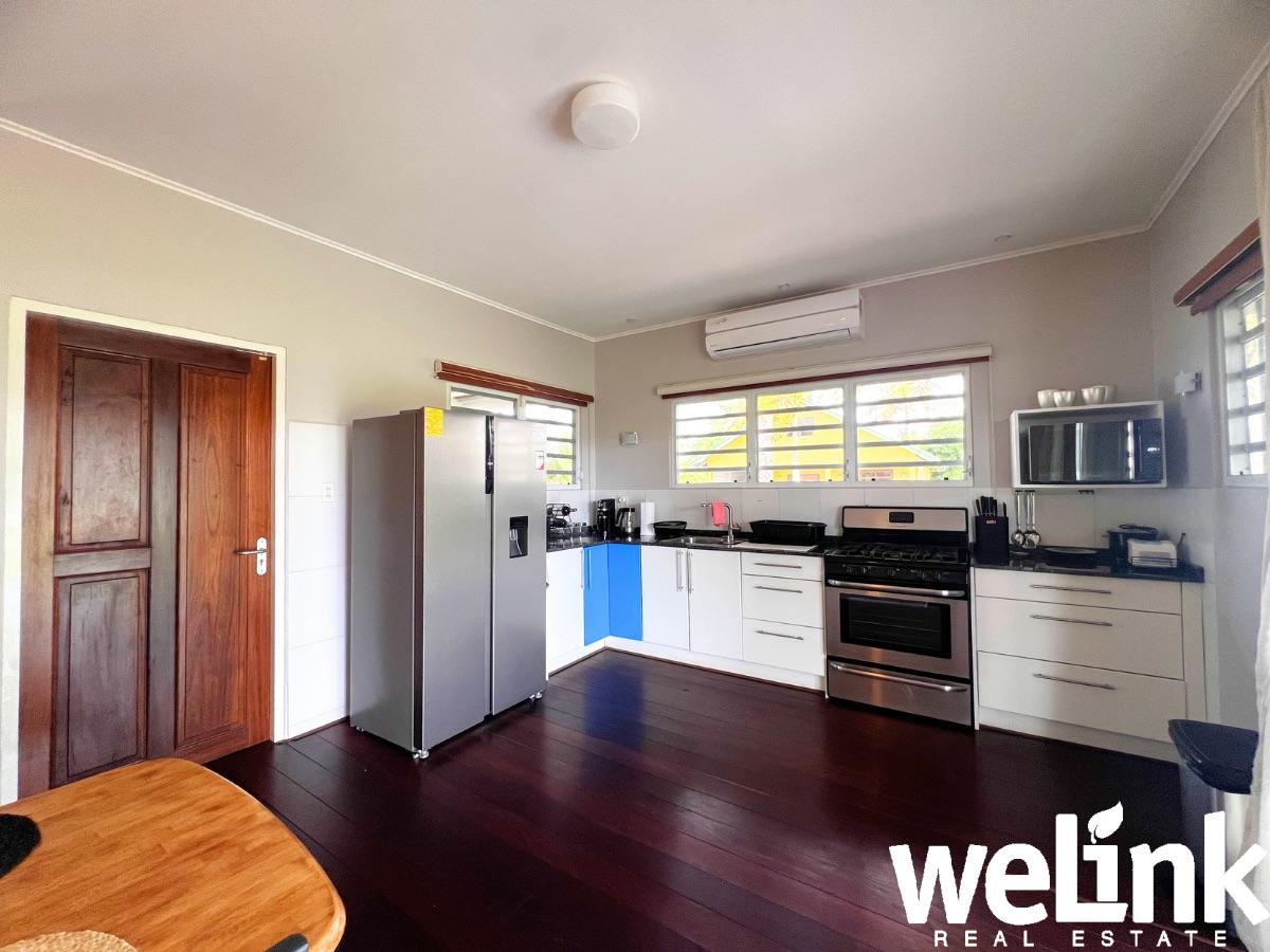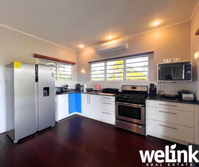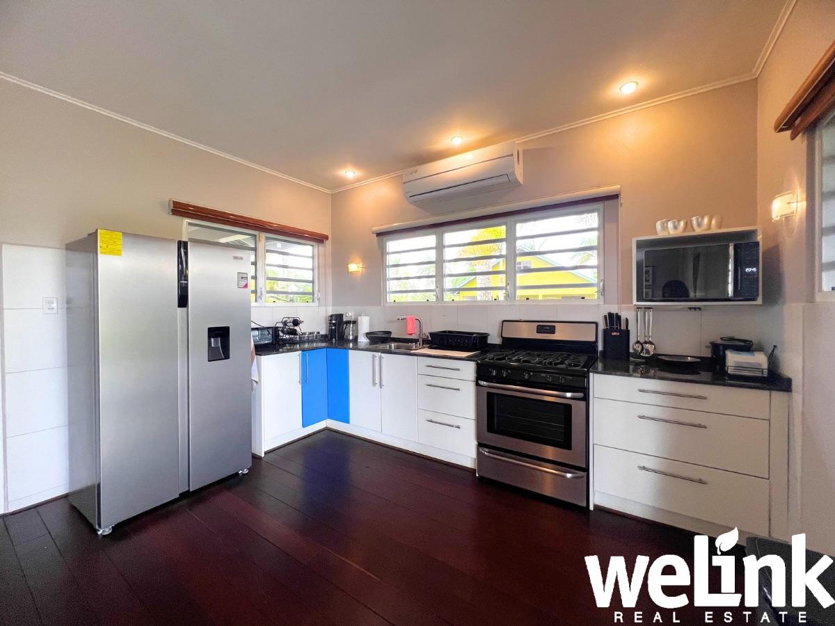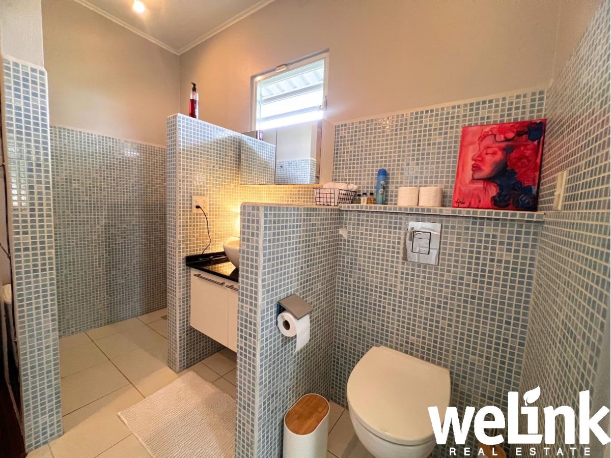 Aansluitend op de woonkamer bevindt zich een compleet ingerichte open keuken met eethoek. Vanuit de keuken biedt een glazen schuifdeur directe toegang tot het achterterras. Het terras is gunstig op de windrichting gesitueerd, waardoor er de hele dag een aangename, natuurlijke ventilatie door de woning stroomt. Dankzij het aanwezige muskietengaas kan optimaal van deze verkoelende bries worden genoten.