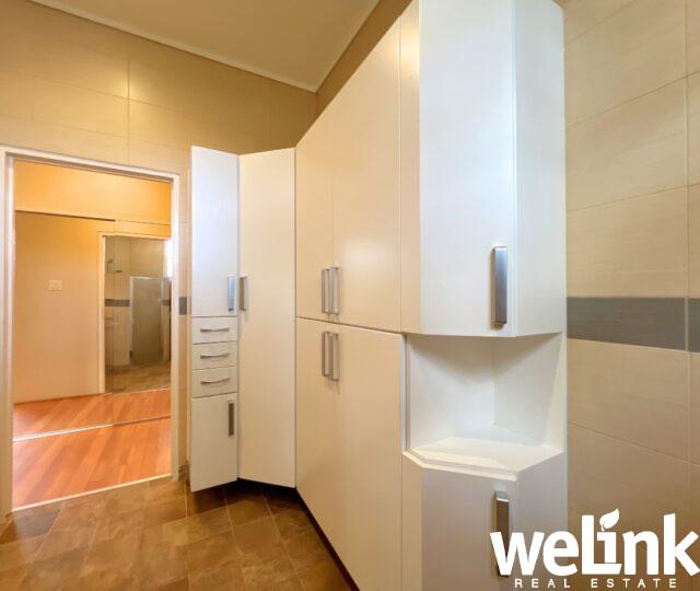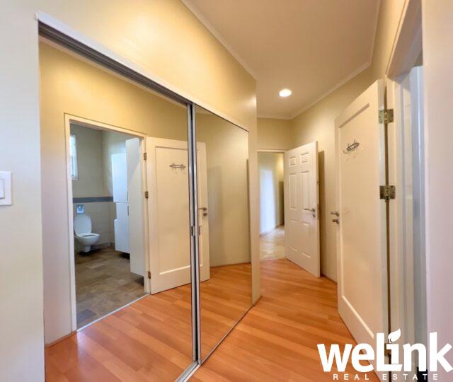 Vanuit de woonkamer leidt een brede gang naar de overige vertrekken. Aan de linkerzijde bevindt zich de inpandige garage met ruimte voor twee auto’s, evenals een praktische wasruimte. Aan de rechterzijde, afgesloten met een solide deur, bevindt zich de gang die toegang biedt tot de slaapkamers.