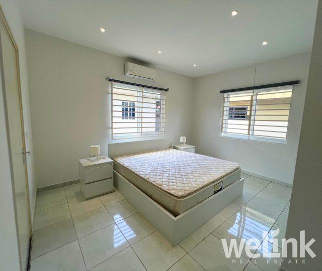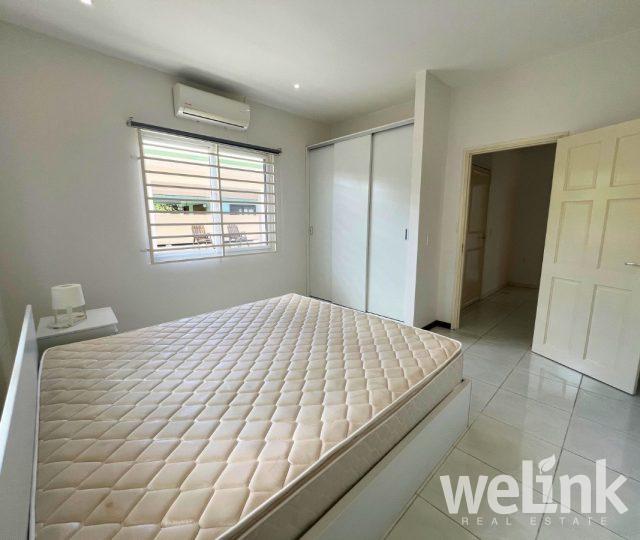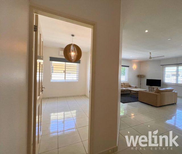 Grenzend aan de keuken bevindt zich een deur die naar een hal leidt. Vanuit de hal is er toegang tot een slaapkamer met een eigen badkamer en toilet, evenals een zijdeur die naar het achterterras gaat. Aan de rechterkant van de woonkamer en de keuken bevindt zich een kleine werk- of slaapkamer. Vanuit de woonkamer bereikt u een brede gang met ingebouwde kast die leidt naar twee slaapkamers, waaronder de master bedroom met een eigen badkamer en toilet, en een gemeenschappelijke badkamer en toilet.