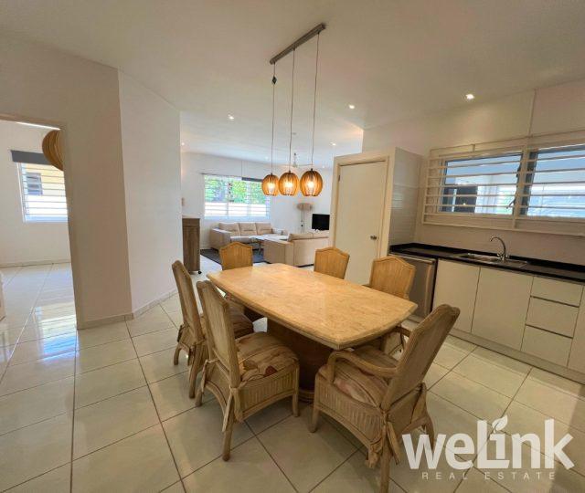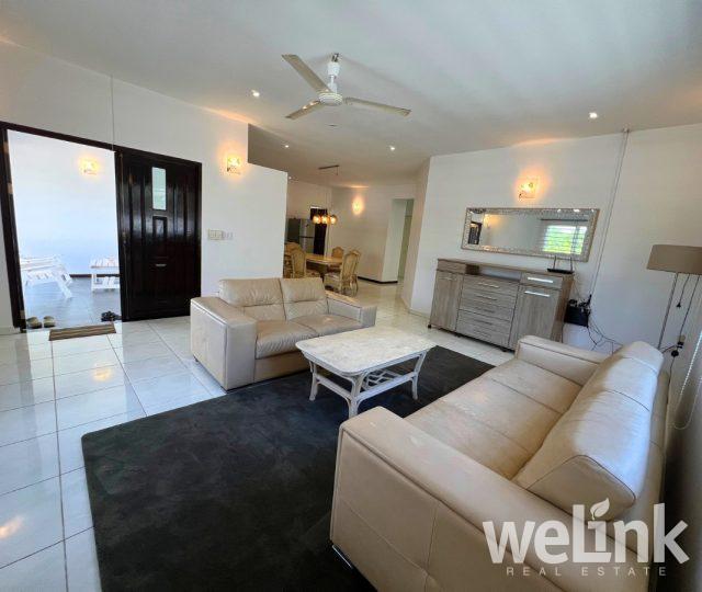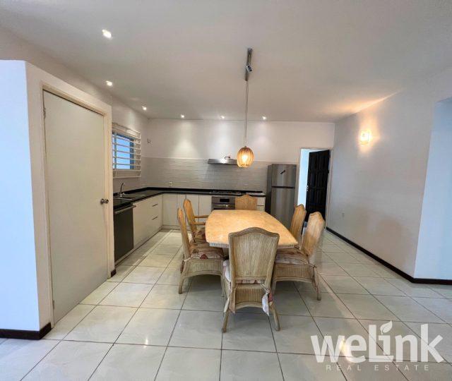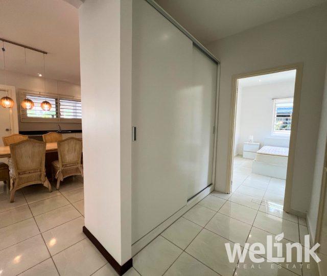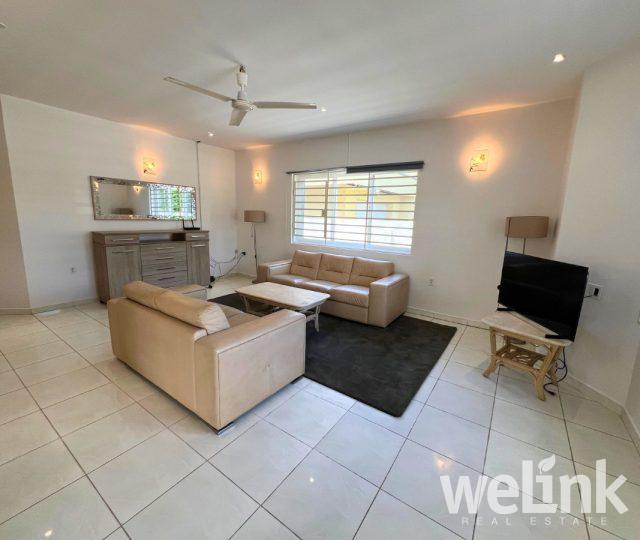 Bij binnenkomst via het voorerf betreedt u een ruim voorterras, volledig beveiligd met muskietengaas en traliewerk, gelegen op het zuiden. Dit terras leidt u naar de woonruimte, die is verdeeld in een comfortabele zithoek en een open moderne keuken voorzien van alle essentiële apparaturen (o.a. koelkast, vaatwasser, gasfornuis + elektrische oven and microwave).