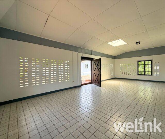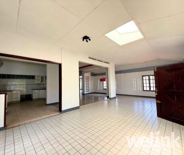 Via de hoofdentree aan de voorzijde komt u binnen in een royale woonkamer, die extra ruim aanvoelt dankzij de voormalige veranda die is omgebouwd met claustra muren. Aan de linkerkant bevindt zich een ruime, functionele keuken met directe toegang tot de gesloten garage, waarachter zich een handige berging/schuur bevindt. Rechts van de woonkamer ligt een gezellig, afgesloten terras – perfect om in alle rust te ontspannen.