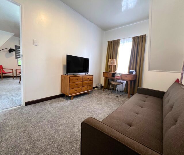 Bij binnenkomst in deze sfeervolle studio bevindt zich aan de linkerzijde een comfortabel tweepersoonsbed en aan de rechterzijde een gezellige zithoek met een slaapbank. De kitchenette, voorzien van de essentiële voorzieningen, sluit hier naadloos op aan. Via een halletje aan de linkerkant bereikt u de badkamer en het toilet.