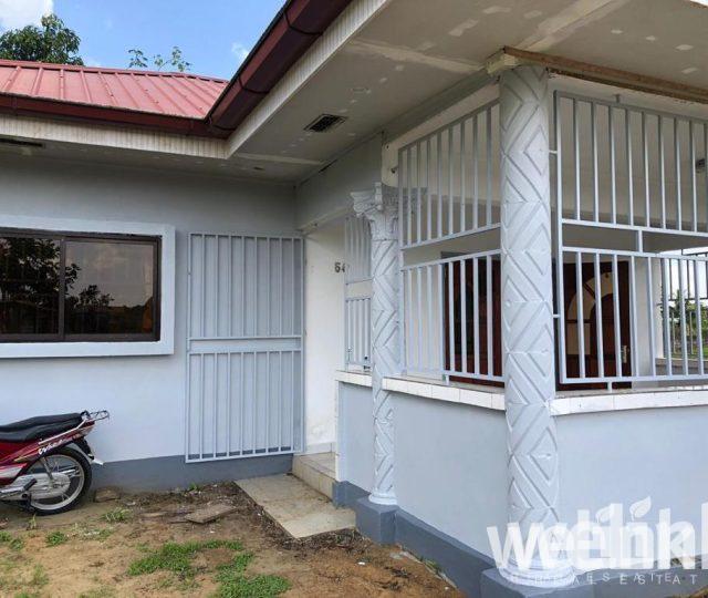 Deze eenvoudige, doch degelijke woning staat op een riant eigen perceel van circa 1,2 hectare in Wanica. Ideaal als starterwoning en voorzien van 110/220 stroomaansluiting. Naast een kleine keuken biedt de woning twee slaapkamers en een badkamer. Er is voldoende ruimte voor tuinbouwactiviteiten.